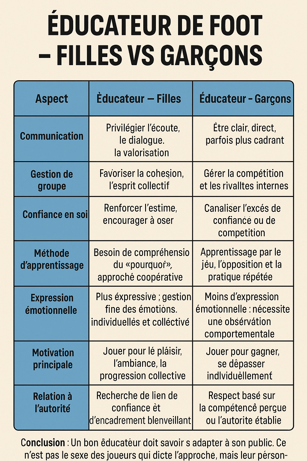La différence entre un éducateur de football pour garçons et pour filles ne tient pas aux compétences de base (tactique, technique, pédagogie), mais plutôt à l’adaptation de l’approche en fonction des besoins, des dynamiques de groupe, et parfois des attentes sociales. Voici les principales différences observées :